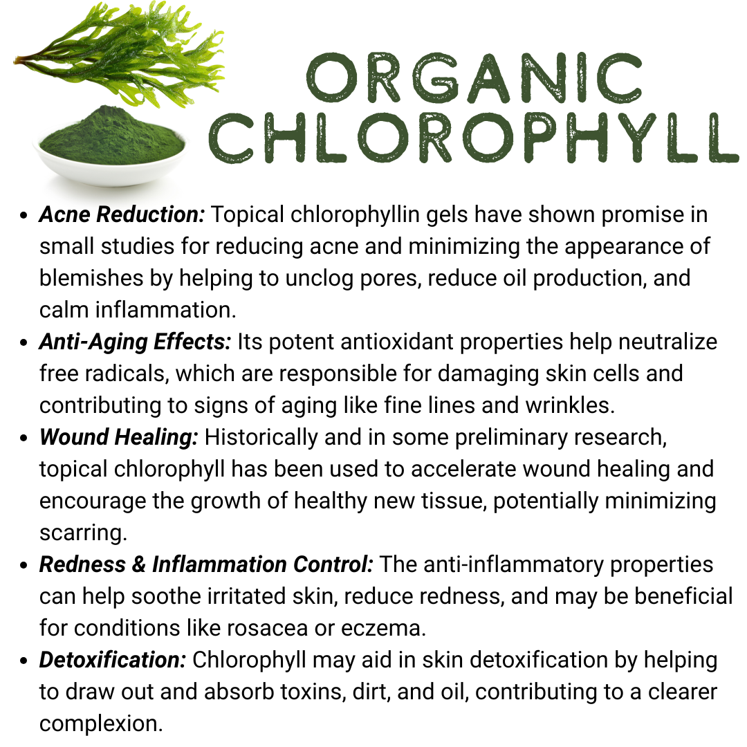 Detoxification: Chlorophyll may aid in skin detoxification by helping to draw out and absorb toxins, dirt, and oil, contributing to a clearer complexion.