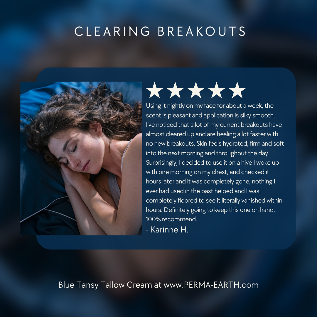 I have been purchasing all my skincare, hair, and body products for at least a few years, maybe 4 or so. I love Perma Earth’s mission and they offer unscented, essential oils, and fragrance. So if you don’t want to use products with fragrance they are clear and transparent about what products contain such. Anyways, I switch up my tallow butters (I used on my face, neck, and chest) but I always order the Blue Tansy every other order or so. I turned a friend on to Perma Earth and she reversed her dermatitis with the Blue Tansy. Just goes to show how awful the modern day skincare products are in the store. Highly Recommend!!
