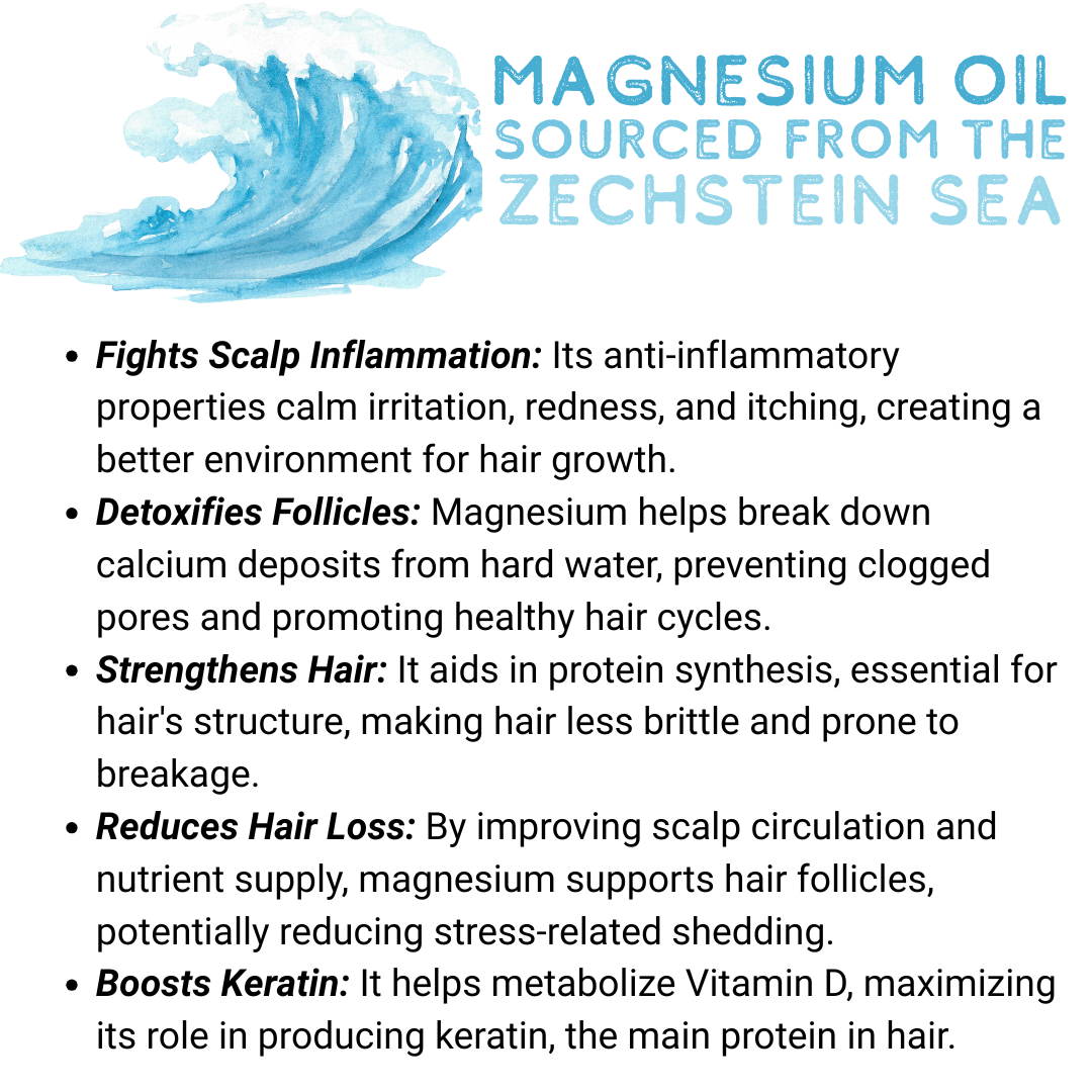 Detoxifies Follicles: Magnesium helps break down calcium deposits from hard water, preventing clogged pores and promoting healthy hair cycles.