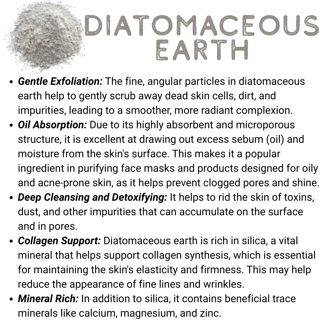 Gentle Exfoliation: The fine, angular particles in diatomaceous earth help to gently scrub away dead skin cells, dirt, and impurities, leading to a smoother, more radiant complexion.