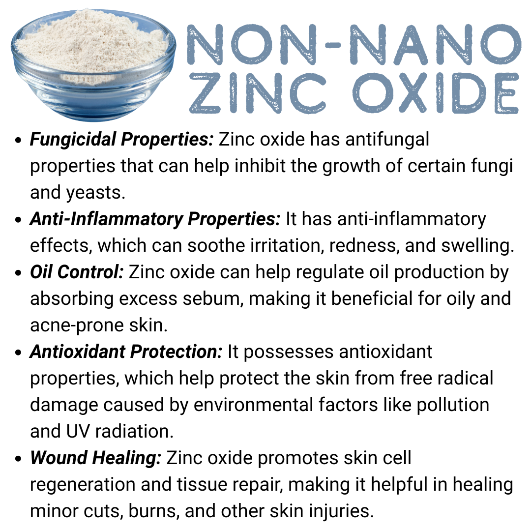 Fungicidal Properties: Zinc oxide has antifungal properties that can help inhibit the growth of certain fungi and yeasts.