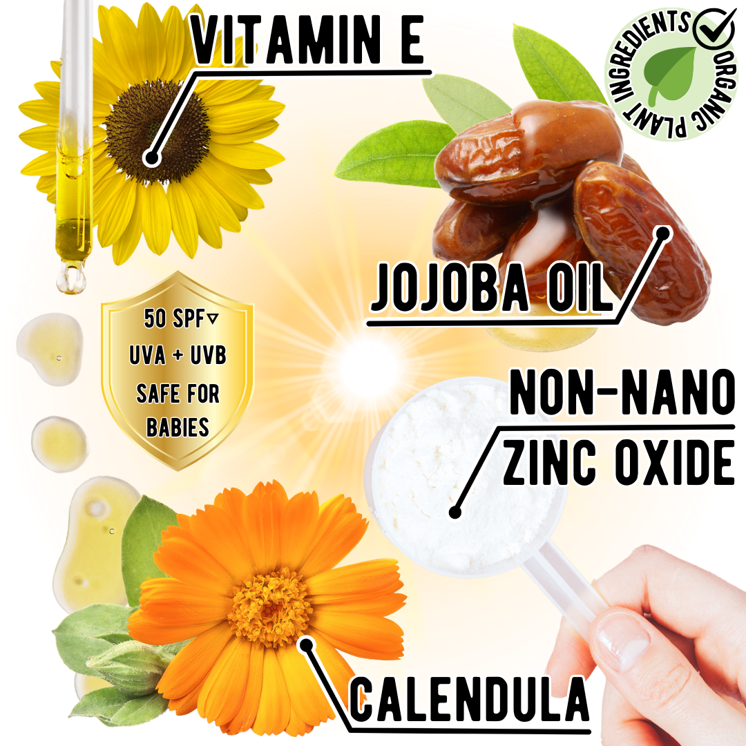 Grass-Fed Local Bovine Cow Suet Beef Tallow, Non-Nano Zinc Oxide (25%), USDA Certified Organic Golden Jojoba Oil, USDA Certified Organic Calendula Flowers (Marigold), and Non-GMO Organic Vitamin E from Sunflowers