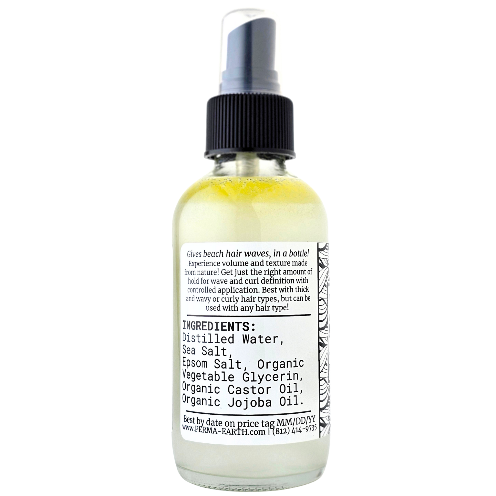 Purified Water, Sea Salt, Epsom Salt, Organic Vegetable Glycerin, Organic Castor Oil, Organic Golden Jojoba Oil, and Isopropyl Alcohol.