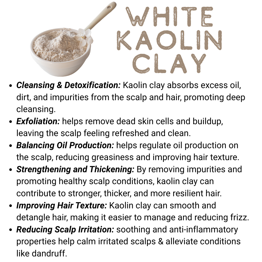 Cleansing & Detoxification: Kaolin clay absorbs excess oil, dirt, and impurities from the scalp and hair, promoting deep cleansing.