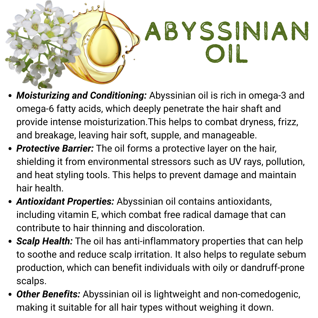 Other Benefits: Abyssinian oil is lightweight and non-comedogenic, making it suitable for all hair types without weighing it down.