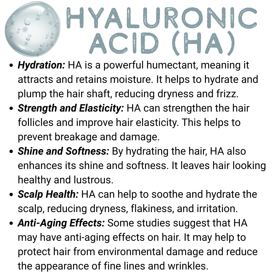 Strength and Elasticity: HA can strengthen the hair follicles and improve hair elasticity. This helps to prevent breakage and damage.