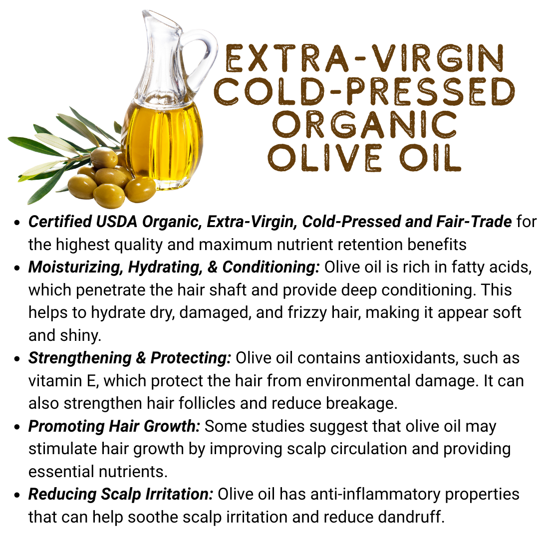 Moisturizing, Hydrating, & Conditioning: Olive oil is rich in fatty acids, which penetrate the hair shaft and provide deep conditioning. This helps to hydrate dry, damaged, and frizzy hair, making it appear soft and shiny.